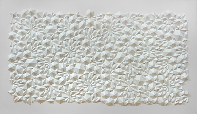 Matthew Shlian 对结构有着敏锐天赋,他能够运用巧妙的折纸技艺和复杂的镶嵌手法,使作品呈现出几何浅浮雕效果。
