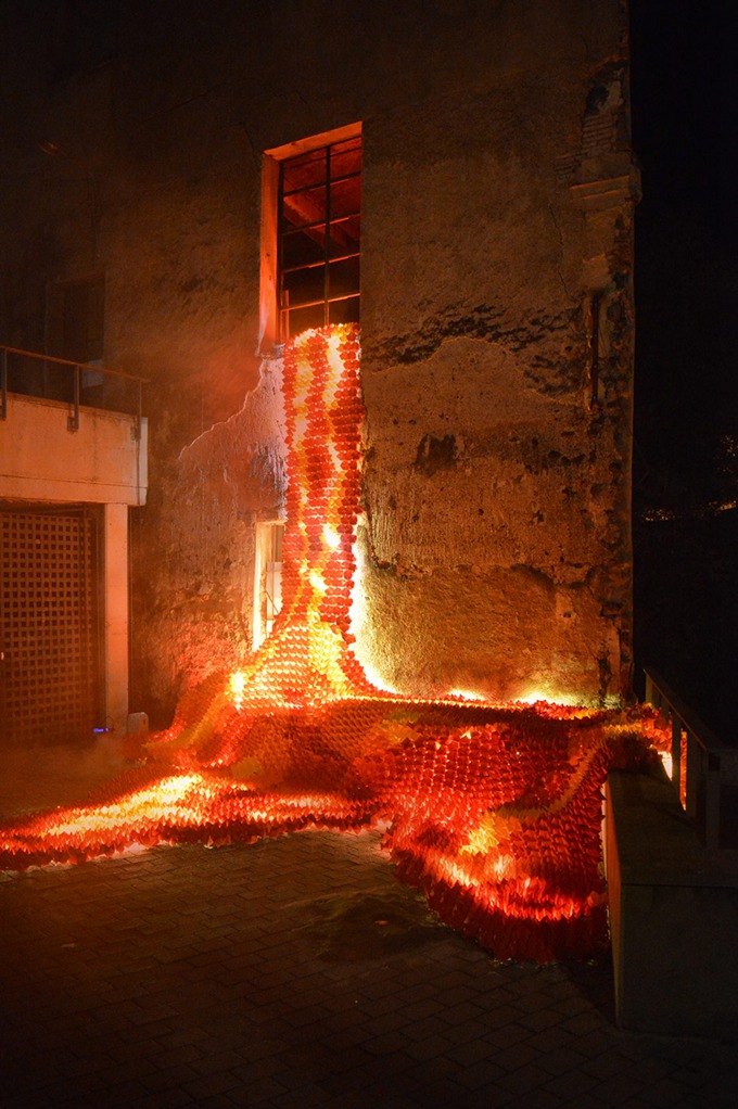 在加泰罗尼亚奥洛特小镇一座废弃建筑中,折纸化为流动的岩浆从窗户中倾泻而出,仿佛占据并入侵周围空间。