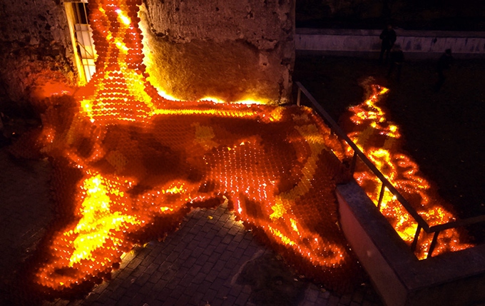 这件作品名为「折纸熔岩」,2018年加泰罗尼亚 LLUÈRNIA 光与火节的其中一件艺术装置,由 David Oliva 和 AnnaJuncà 共同创作,使用超过10000张不同色调的红、橙和黄色折纸,配合灯光和发烟器,制作出岩浆喷涌而出的效果。整件覆盖超过100平方米的空间。