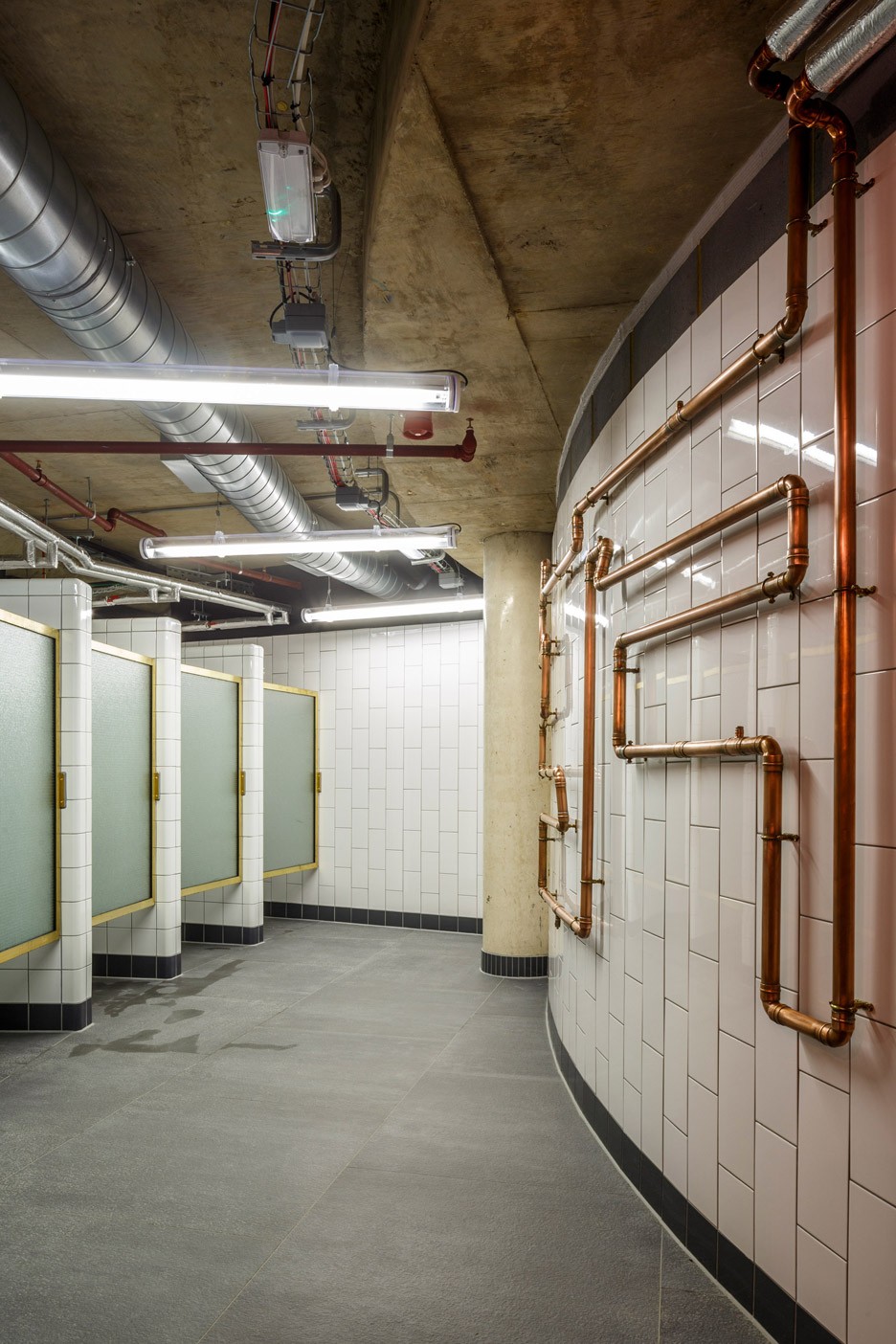 深色的整体背景氛围,发光的霓虹灯管,银色的天花板,做旧的黄铜灯管与白色瓷砖。使得这座健身房宛如《浴血黑帮》的拍摄现场,正在上演阴谋和背叛的故事。