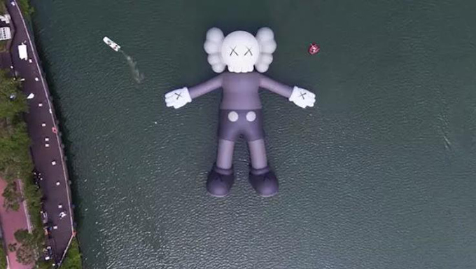 同年,韩国首尔的Seokchon湖面上出现了一只庞然大物,28米长的雕塑却轻盈的浮在水上,空中俯瞰才发现,这不正是KAWS的标志性形象“COMPANION”么!