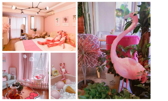 图片展示的这种粉红粉红的室内装潢,应该很多人都不陌生,是现在非常流行的ins风,由一个粉色为基本核心,火烈鸟、龟背竹、霓虹灯、波波池以及各种金属框物件进行的一种室内装饰风格。