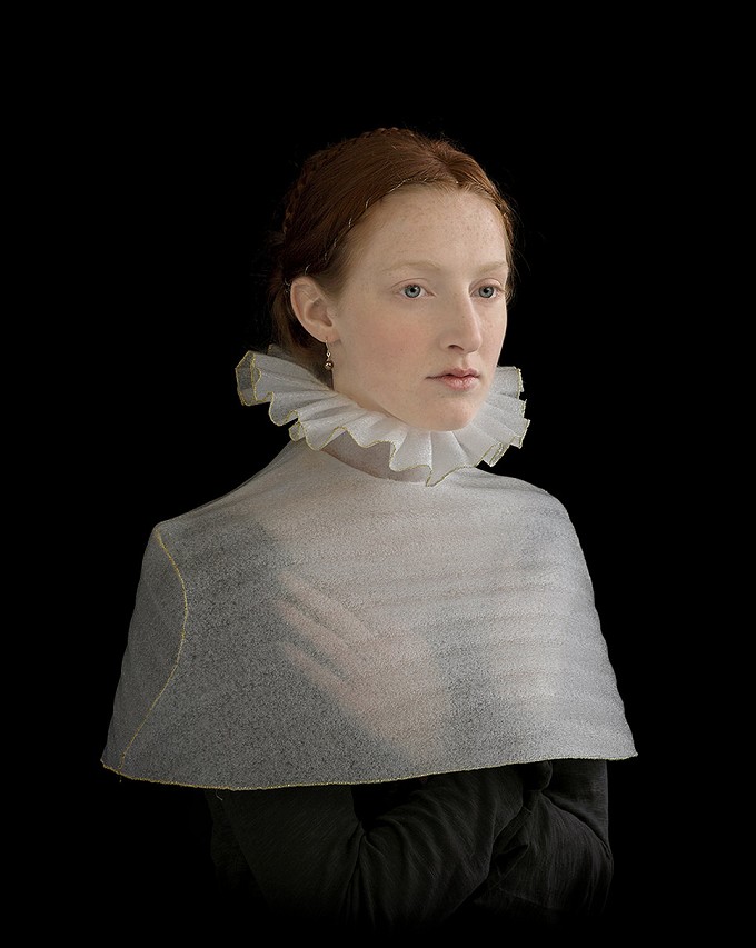 例如下面这件作品就参考了罗希尔·范德魏登1460年完成的画作《仕女像》。她的帽子由珍珠棉制成,手上戴着一个番茄酱的盖子。
