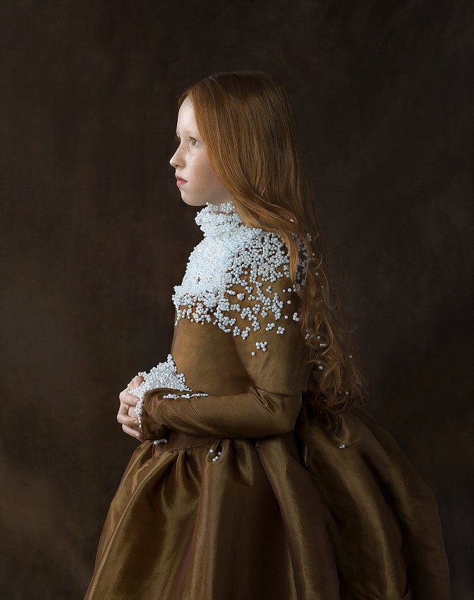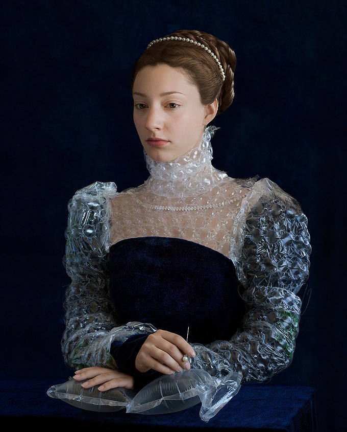 在她看来,发泡胶、气泡垫、胶膜、珍珠棉等塑料包装与更为精致的丝绸、蕾丝等面料并无太大差别,只要通过巧妙的服饰搭配、配以合适的人物妆容和神情,一样可以拍出犹如文艺复兴时期油画般的肖像照。