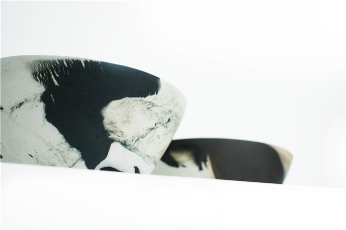 工艺介绍:将黑白灰三种颜色的泥揉合后,利用滚压头的旋转一次形成内外两种完全不一样的画面,内壁呈漩涡画面而外壁呈色块状。画面是泥的颜色,而不是在表面画出来的图案,画面完全是自然呈现。