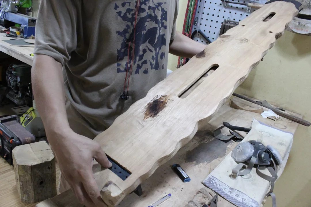 这一步也有保证音色纯正的作用,古琴的音就叫“中华正音”。而既然我们之前说过——琴身中用了被戏称为“棺材板”的阴木。