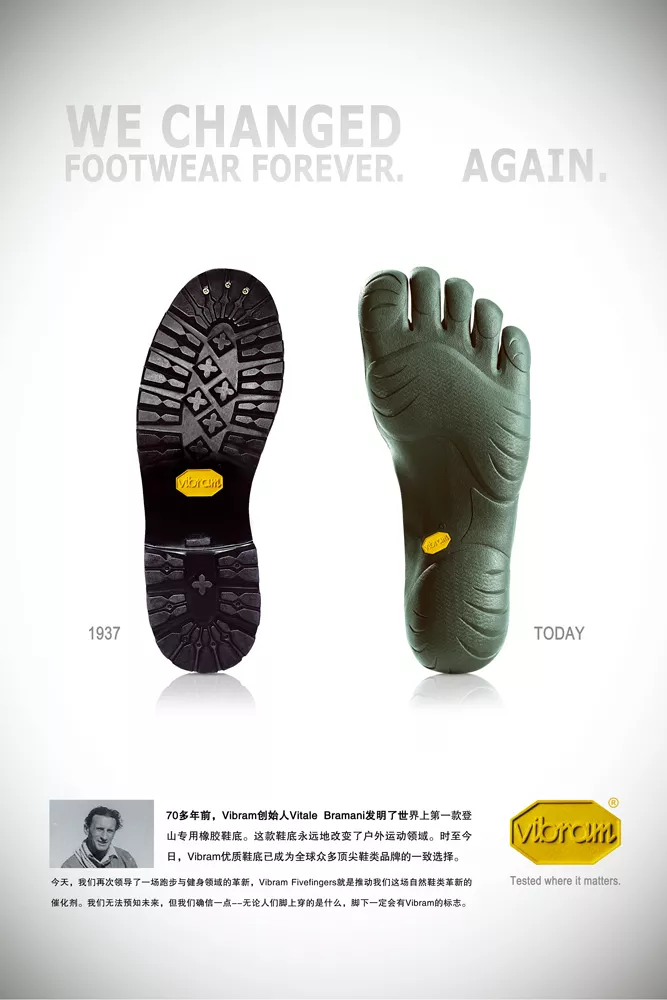 提到举世闻名的“鞋底”,就不得不说说来自意大利的橡胶品牌VIBRAM。1935年,意大利人Vitale Bramnni带领一队攀山队在阿卑斯山探险时遇上大风雪,其中六人因无法及时下山而死亡。