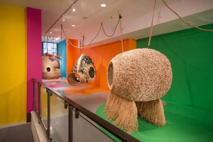 这个看似巨大的鸟窝的艺术品,是与南非手工艺品相融合的,它被悬挂在色彩分明、对比感强烈的背景板上做展览。