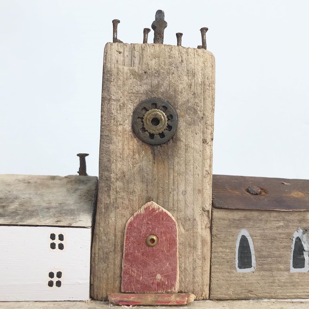 她从海上捡来瓶盖、钉子、金属垫圈等废弃物,让破损的瓶盖变成灯塔的屋顶,生锈的钉子变成小屋的烟囱,就连金属垫圈都被成了挂在墙壁上的救生圈。为了让作品保留这些漂流物原本的色彩,Kirsty 尽量使用最少的油漆为漂流木上色。