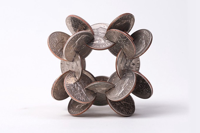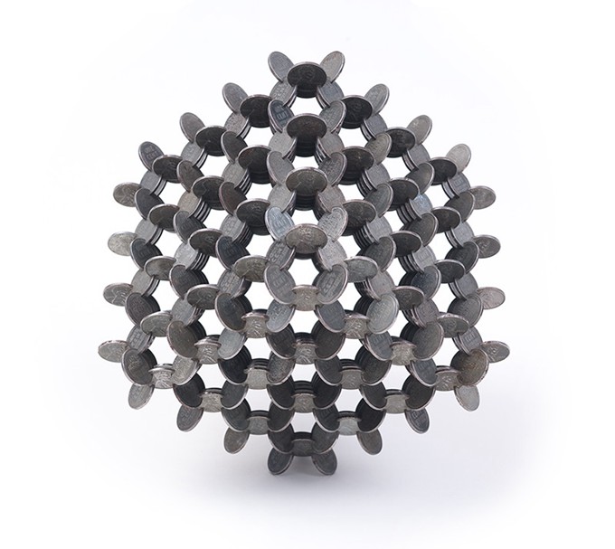 几年的时间过去了,他的创作形式没有改变,依旧是将硬币切割、拼接,但是拼接的技巧明显有了变化。但是这次,普通的立方体已经不能满足他了,他将硬币组装成更加眼花缭乱的形态,比如3枚硬币组成的简单球状,已经是这批作品中最不起眼的形态。