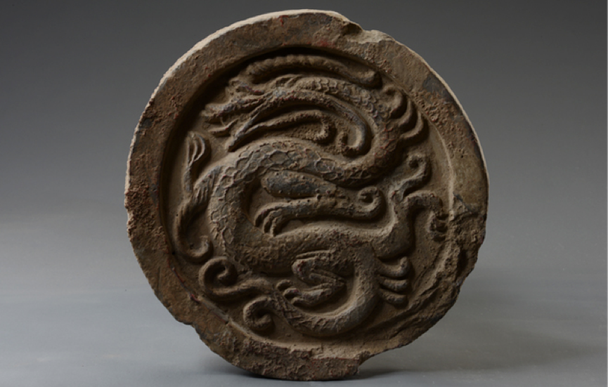 「汉•青龙纹瓦当」:宫殿用瓦。当面一龙,身体盘曲成弓形,昂首伸爪,腾云飞翔,威猛无比。龙身之上龙鳞刻画细致,富有张力。四神之中青龙象征东方、左方、春天,为四神之首。