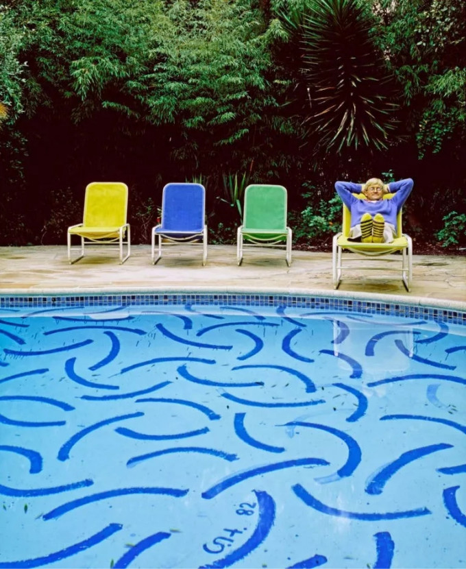 游泳池也是Hockney家最出名的地方,他亲自在泳池底部画上弯曲的蓝色条纹。