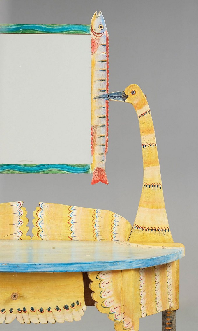 这个梳妆台呈现了鸟儿叼着小鱼的造型,小鱼位于镜子两侧,依靠鸟嘴的支撑与梳妆台相连接。