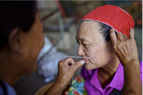 她们手嘴配合,将棉线交叉如绳,