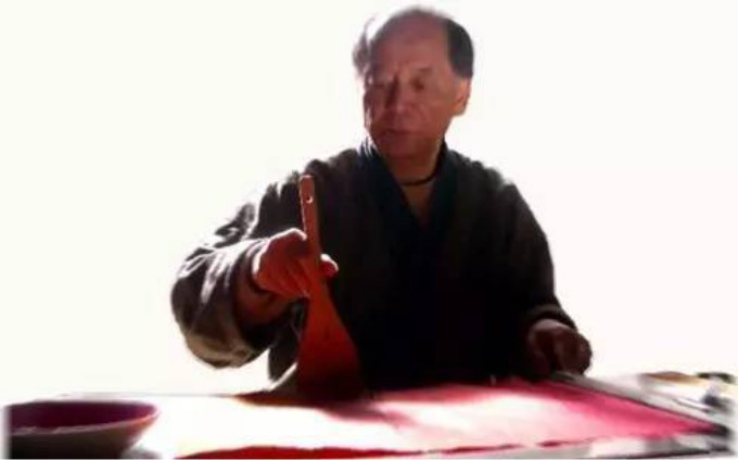 第二道工序,刮浆,把准备好的白布平铺在桌面上,用铲子或者木板把防染浆涂满雕刻好的镂空板,然后把布风干,准备染色。