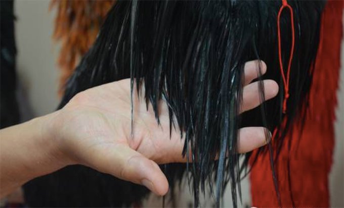 做一把蔡氏贡掸一共需要18道工序,而第一道工序,便是最关键的一步——挑选翎毛。好的翎毛应当质地轻薄、色泽鲜亮,轻轻一吹,灵动得如同仍长在鸡的身上一样。通常需要取上百只乃至上千只同色公鸡身上的“三把毛”,经过严格的二次挑选,才能收集一把蔡氏贡掸的原材料。这些鸡毛要经过由多味中药制成的药物高温消毒,完全去除异味后才能投入制作。