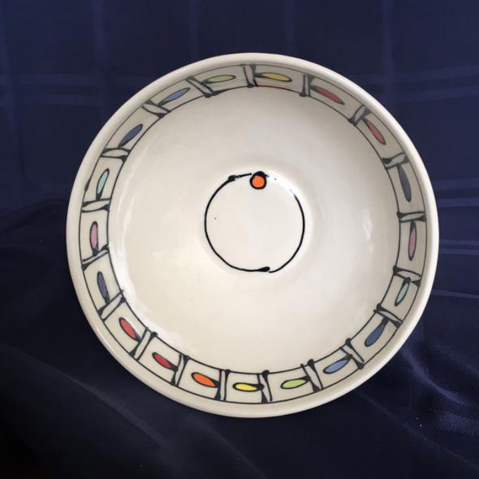 一个装饰着许多有趣的彩色点的古怪的瓷质日用小碗。