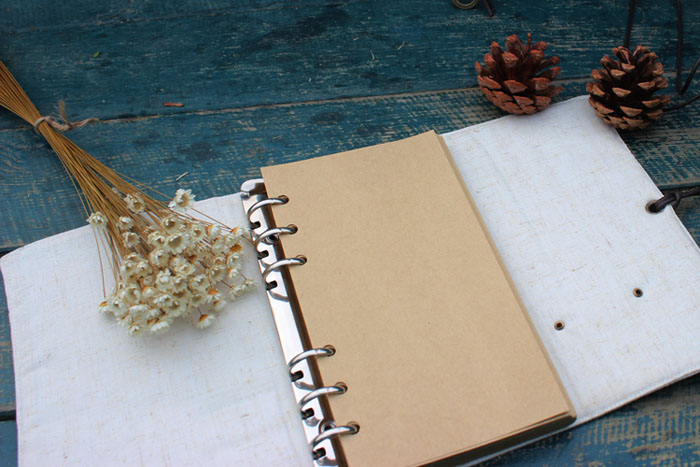 这本笔记本的封面为布面材质,内页装有80张牛皮纸,以六孔活页装订,可以180°自由打开。