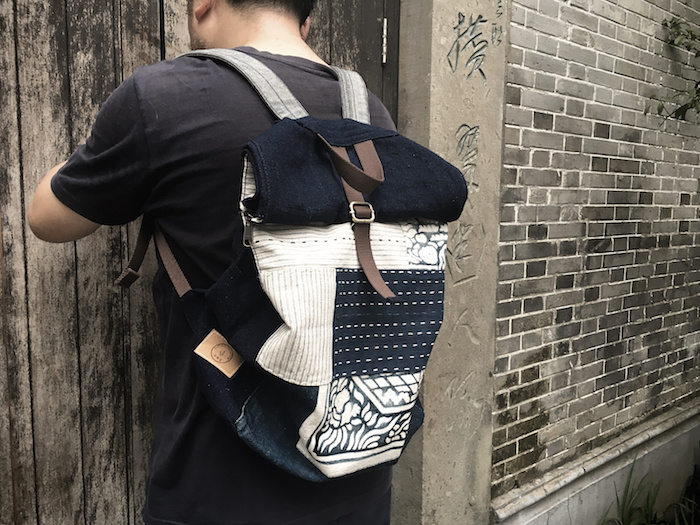 「行者」包采用了拼布的设计手法,把蓝夹缬布和不同的手工织染的老土布组合,打破了蓝夹缬方块图案单一刻板的视觉印象。外型设计上也并不走传统路线,相反卷口双肩包表现出了一些潮牌风格。