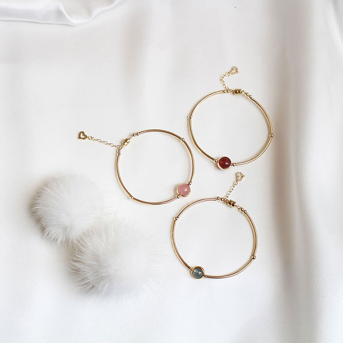 这款手镯共有三种款式,分别为粉晶、草莓晶和月光石,材质为美国进口14KGF、天然草莓晶、粉晶、月光石。简约但不简单的样式,将是你整体穿着的点睛之笔。