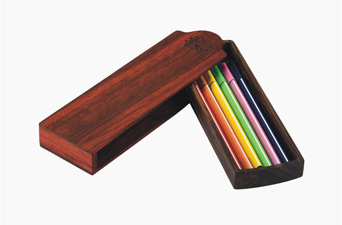 这件文具盒的材质为紫檀和黑酸枝,采用传统手工木艺,实木结构,现代机器辅助开料,因此产品有着明显的手工痕迹。