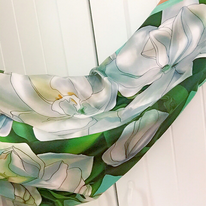 这是一款来自独立设计品牌 JOJOWorkshop 的原创丝巾——《水墨茉莉(青绿色)》。采用19姆米重磅真丝面料,手工卷边工艺。丝巾大小为90cm x 90cm。