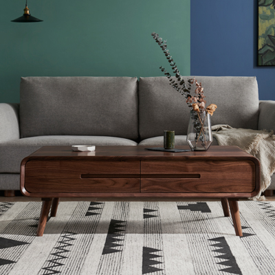 物应「凝月茶几」简约黑胡桃红橡木实木四抽茶几带抽屉茶桌方边几