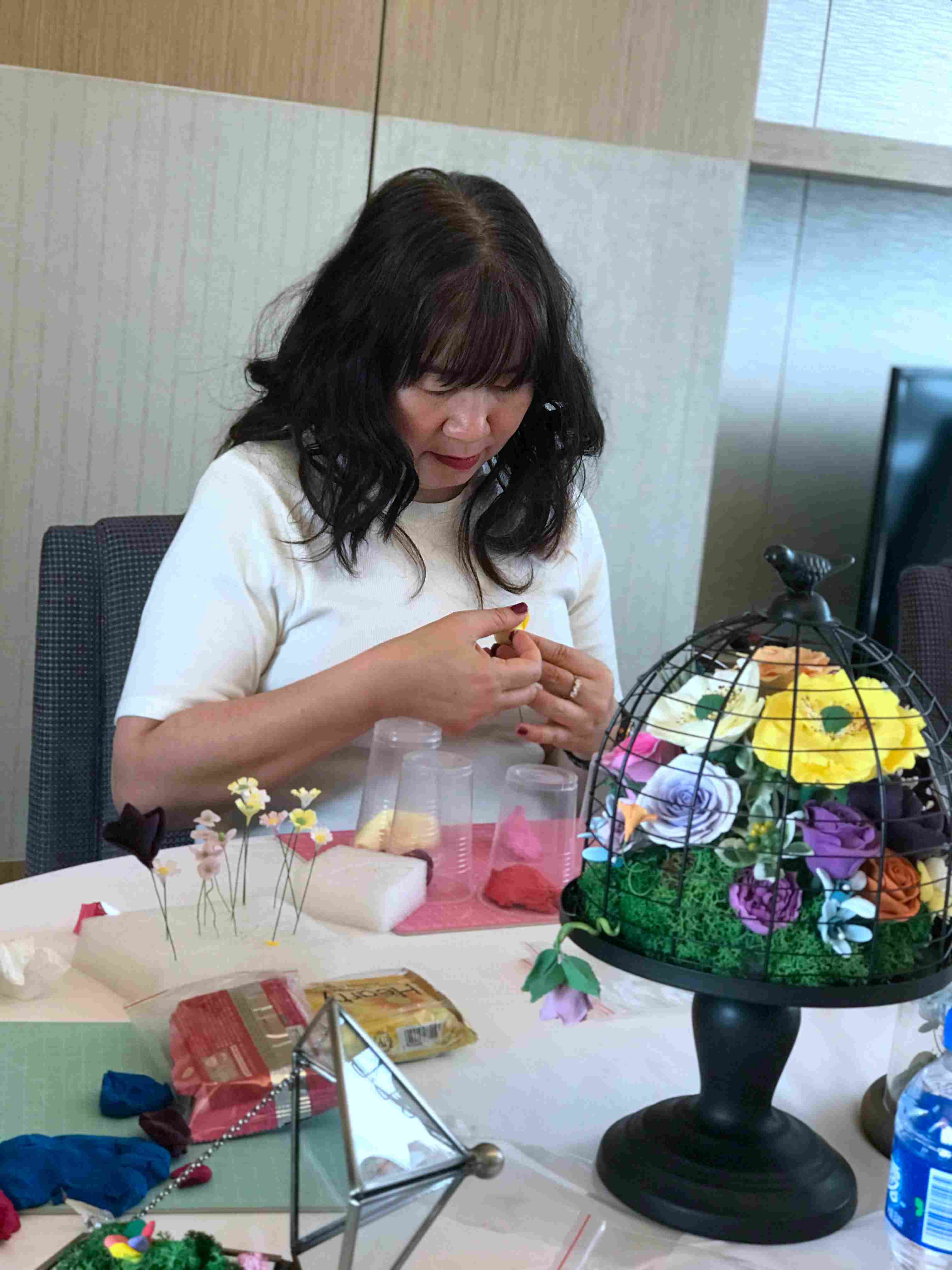 郑婷,社区志愿者手工面塑老师,因为热爱手工热爱鲜花,无意间就想着可否能用面团捏出一朵玫瑰花,经过一番努力研究,材料的选择以及捏制手法的运用,终于制作出自己很满意的捏塑花。开始将捏塑花运用到生活,结合家居配件:木器、玻璃器皿,让捏塑手工得到更好的推广。无论男女老少,只要你有颗想尝试的心,大胆去发挥,便能创造出一份属于自己的美好作品。